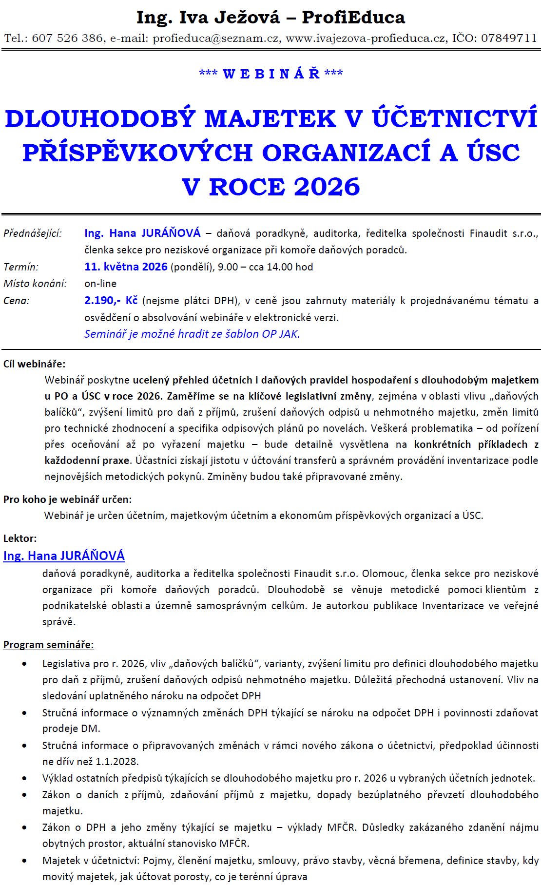 Dlouhodobý majetek v účetníctví příspěvkových organizací a ÚSC v roce 2026 - webinář