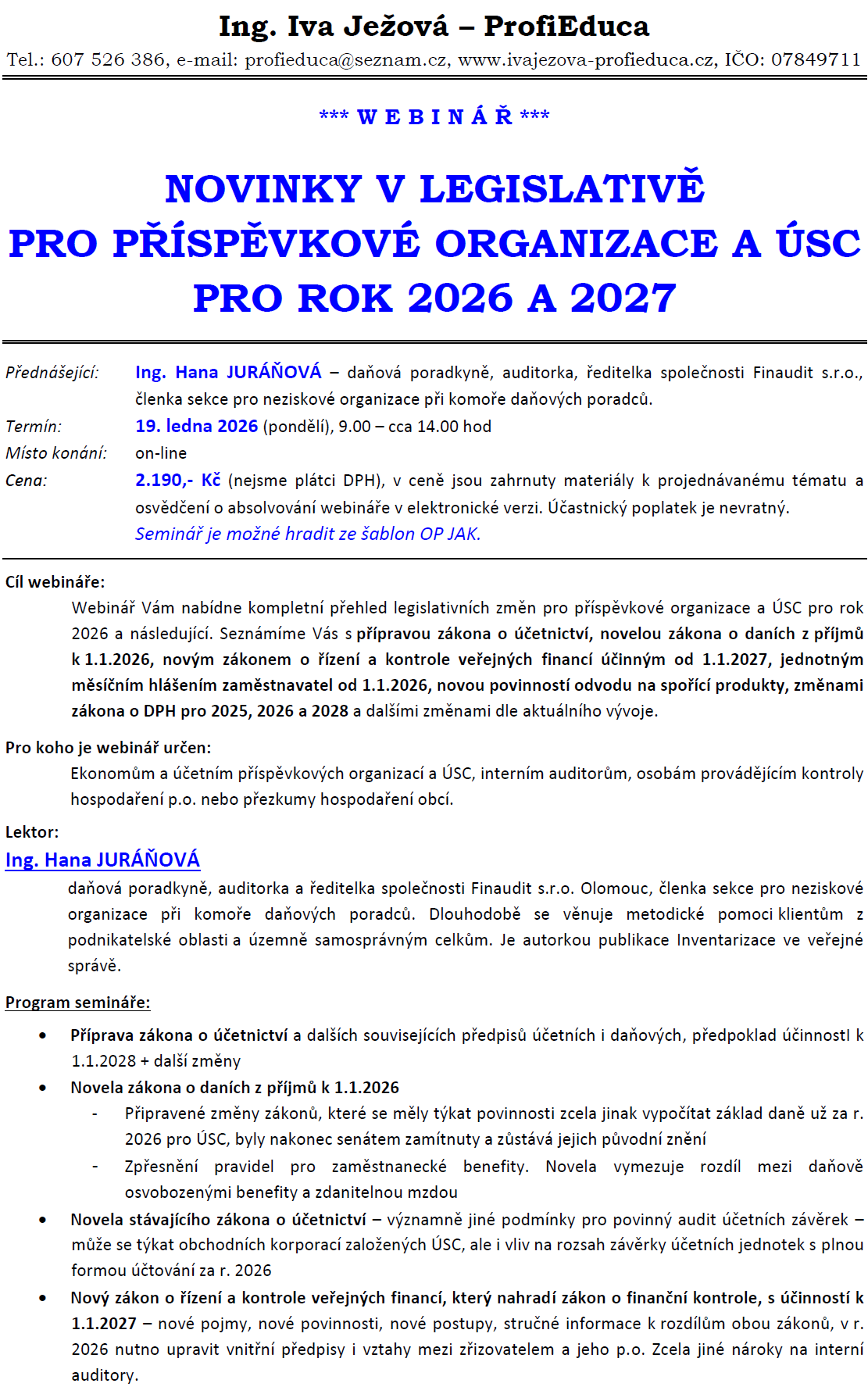 Novinky v legislativě pro příspěvkové organizace a ÚSC pro r. 2026 a r. 2027 - webinář