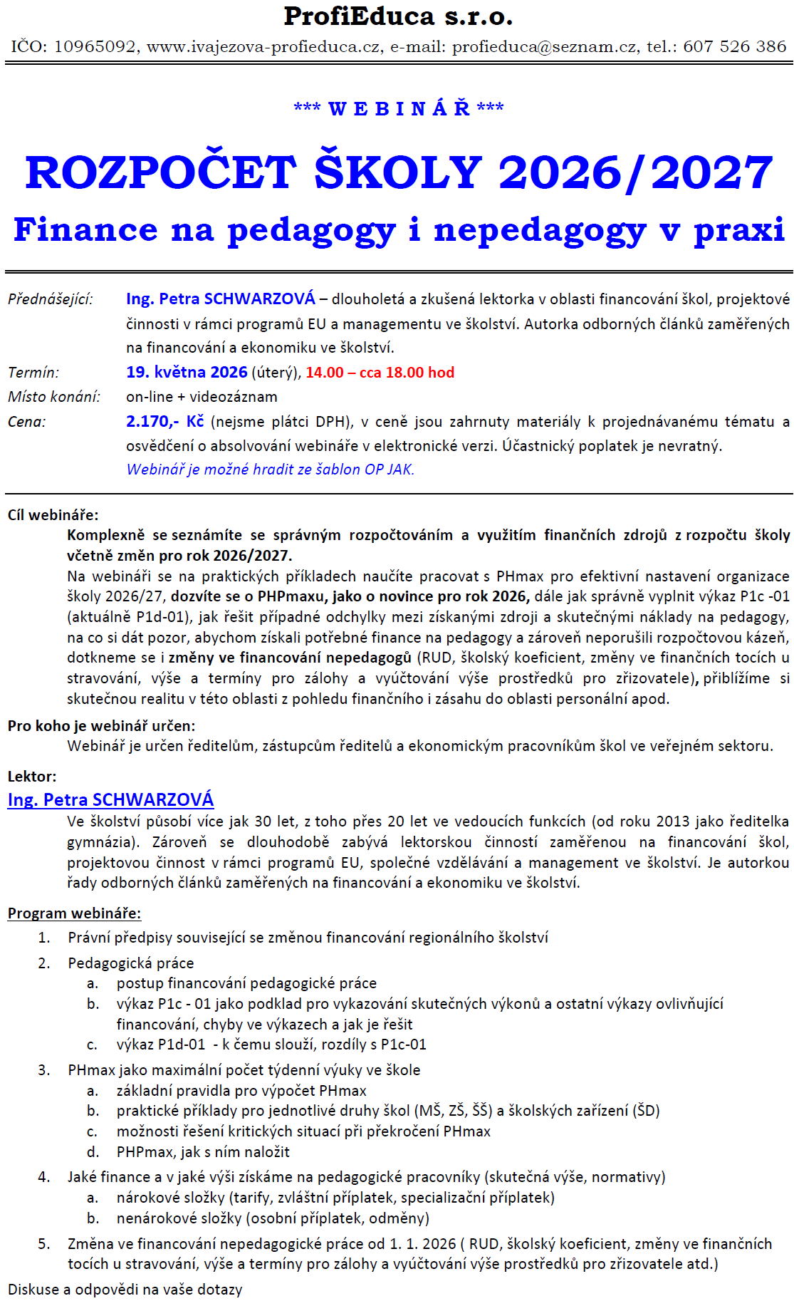 Rozpočet školy 2026/2027 - finance na pedagogy i nepedagogy v praxi - webinář