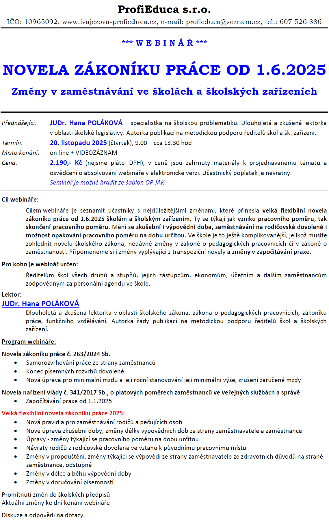 Novela zákoníku práce od 1.6.2025 - změny v zaměstnávání ve školách a školských zařízeních - webinář
