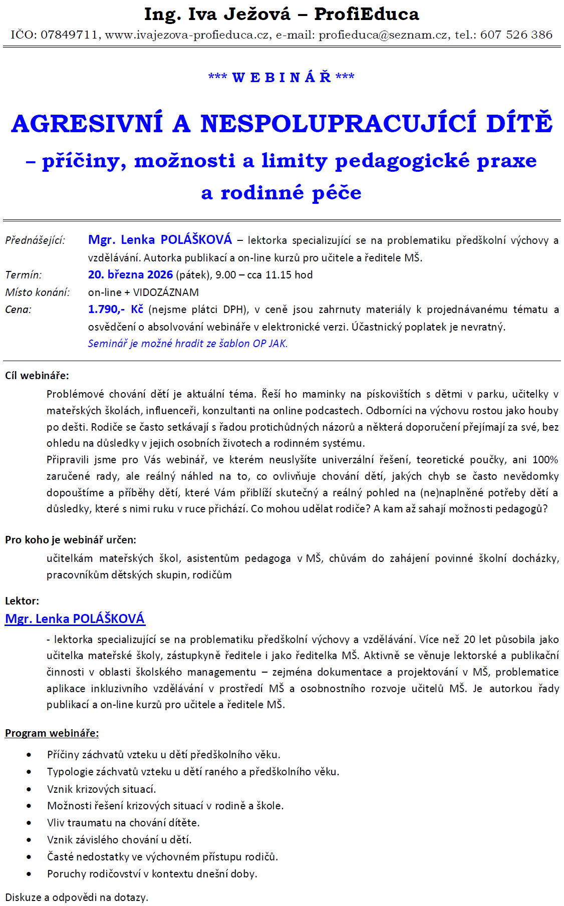 Agresivní a nespolupracující dítě - příčiny, možnosti a limity pedagogické praxe a rodinné péče - webinář