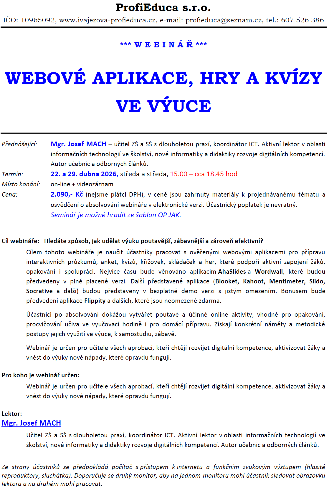 22. - 29. 4. 2026, on-line, středy vždy od 15.00 hod