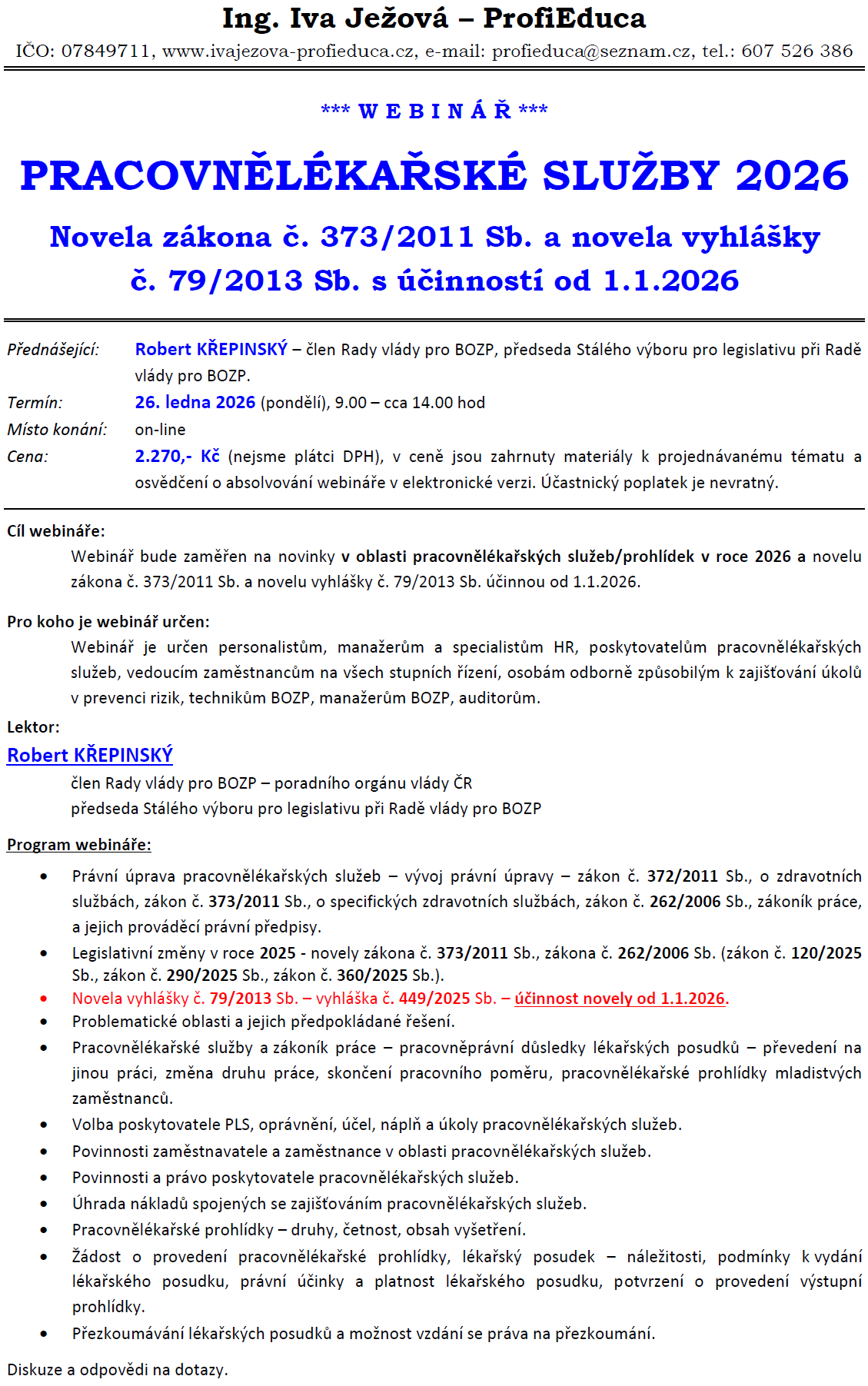 Pracovnělékařské služby 2026 - novela zákona č. 373/2011 Sb a novela vyhlášky č. 79/2013 Sb. s účinností od 1.1.2026 - webinář