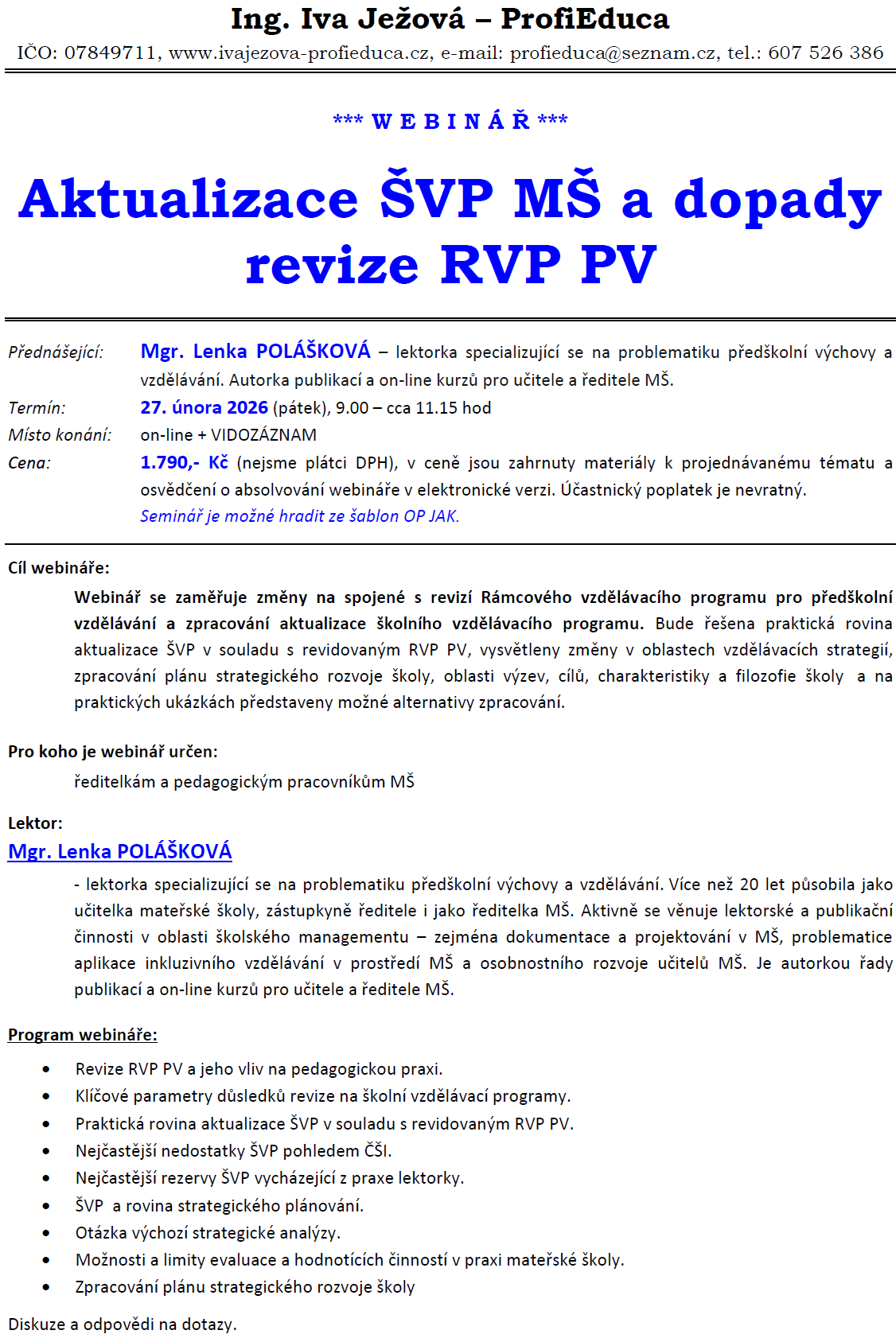 Aktualizace ŠVP MŠ a dopady revize RVP PV - webinář