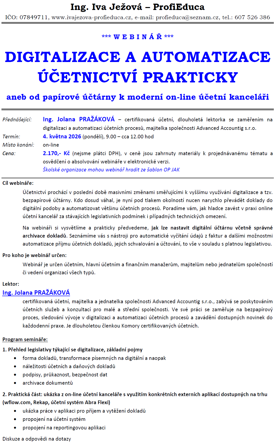 Digitalizace a automatizace účetnictví prakticky aneb od papírové účtárny k moderní on-line účetní kanceláři - webinář