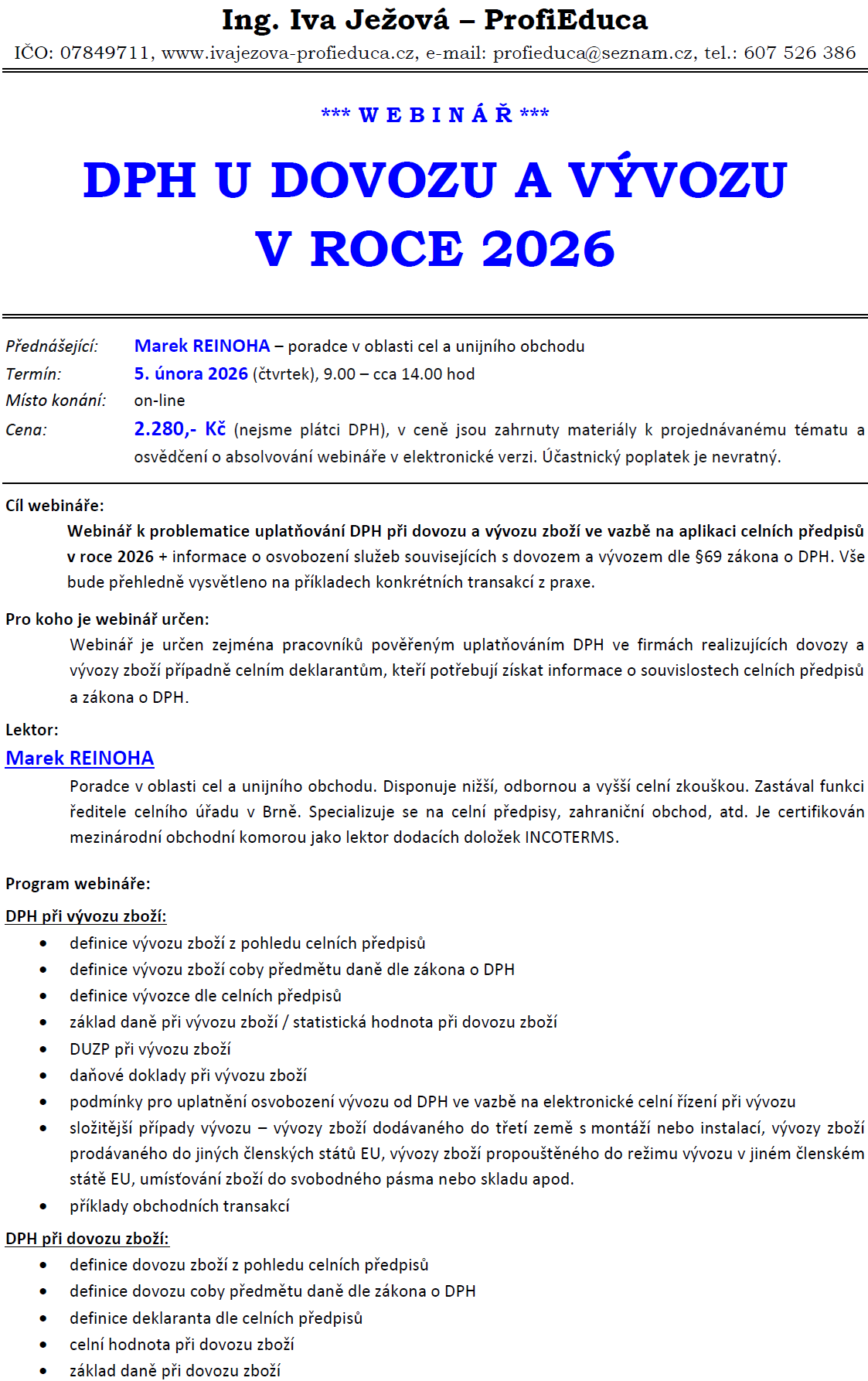 DPH u dovozu a vývozu v roce 2026 - webinář